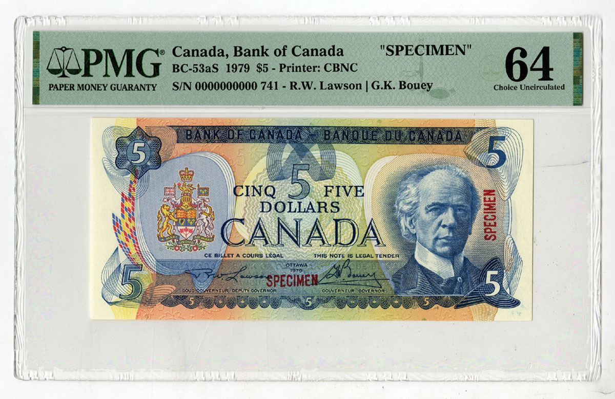 Canada, 1979. $5, P-92aS, BC-53aS, Specimen Banknote, Blue on m/c underprint with Sir Wilfrid Laurier at right, Lawson | Bouey signatures, Red Specimen overprints, S/N 00000000000 741, PMG graded Gem Uncirculated 66 EPQ. Printer: CBNC.