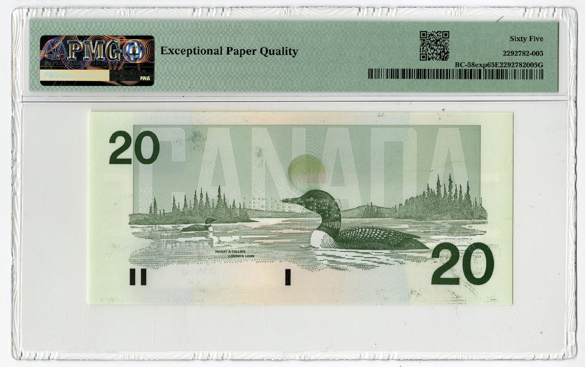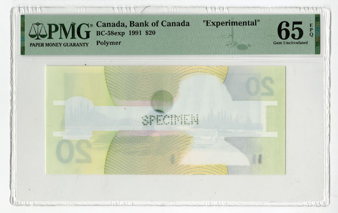Ottawa, Canada, 1991, $20, P-97tp, BC-58bPE (also described as BC-58exp), "Printers Essay - Experimental" DuraNote Polymer paper test banknote with 1/2 inch clear circular window Security Feature, Printed on DuraNote polymer plastic paper substitute, the obverse is missing the main printing and only has the m/c undertint with security feature and Pin-punched SPECIMEN. The reverse has the normal design and color with the "Common Loon" swimming duck on a lake with trees in the background and with the security device also appearing on the back. No Signatures, PMG graded Gem Uncirculated 65 EPQ. This essay note was part of a project by Mobil Oil for testing petroleum based hydrocarbon polymer paper for printing banknotes.