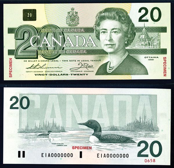 Canada, 1991. $20, BC-58aS, Unlisted Specimen banknote, Red specimen overprints and "EIA 000000" serial numbers. PMG graded Gem Uncirculated 66 EPQ, 17 graded with only 2 graded higher, BABNC.