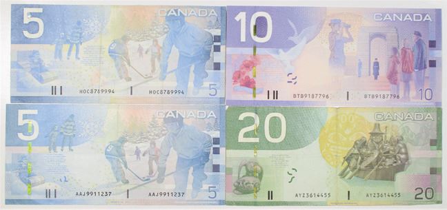 CanadaÉ Group of Issued notes includes $5, 2002-2006, P-101 (1) and P-101Aa, blue and tan-yellow, Sir Wilfrid Laurier at left; $10, 2005, P-102Ab, Purple and tan on m/c underprint, Sir John A. Macdonald at left; $20, 2004, P-103a, green and tan on m/c underprint, Queen Elizabeth II at left. Notes range from Fine-Choice AU (4) (Sold "AS IS" No returns accepted)