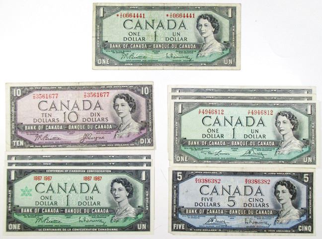 CanadaÉ Lot of 9 notes, Includes $1 (7); $5 and $10, all with Modified hair. Notes range from Fine-VF (9)(Sold "AS IS" No returns accepted)