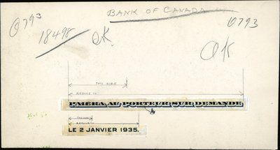 1935. P-38 to P-57. Pen, ink and paint drawing of text "PAIERA AU PORTEUR SUR DEMANDE - LE 2 JANVIER 1935" found below title on face and to be used on the French 1935 Issue with archival notations and instructions of measurement changes. Back has Oct.22, 1935 green handstamp. Printed on 10.25 by 5 inch white card. Unique in archive. Canadian BNC