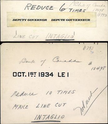 1935. P-38 to P-57. Pen, ink and paint drawing of essay text including: 1). Essay "Oct.1st 1934 Lei" to be used on the French 1935 Issues with archival notations and instructions of measurement changes."Not Used" on lower right. 2). "Deputy Governor Depute Gouverneur" with instructions "Reduce 6 times"; 3). Card with cut out portions of proof text from 1923 series of banknotes with instructions to change sizes. Bottom has notation "Not Used". All have Oct.22, 1935 green handstamp on back. Various size white cards. All unique in archive. Canadian BNC