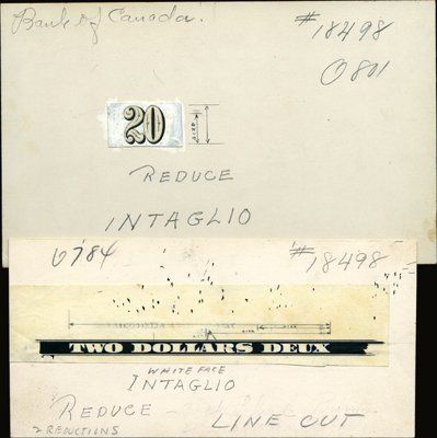 1935. P-38 to P-57. Pen, ink and paint drawing of essay text including: 1). Essay "Two Dollars Deux" to be used on the French 1935 Issues with archival notations and instructions of measurement changes. 2). "20" with instructions "Reduce"; 3). Essay "Fifty Dollars" to be used on the 1935 Issue with archival notations and instructions of measurement changes. 4). Essay "One Thousand Dollars" to be used on the 1935 Issue with archival notations and instructions of measurement changes. 5). Canadian BNC envelope with archival notations that this envelope has specimen banknotes (Which were missing). All on various size white cards. All have Oct.22, 1935 green handstamp on back. All unique in archive. Canadian BNC
