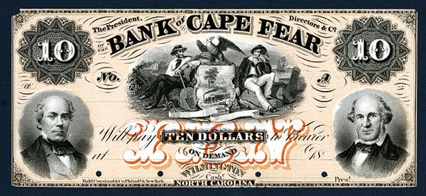 Wilmington, North Carolina, 18xx, $10, Proof printed on india paper unmounted with black text, vignettes and counters on light red underprint, POC's appears Choice Unc. But there is a small piece of the upper left corner tip missing. Attractive and scarce note.