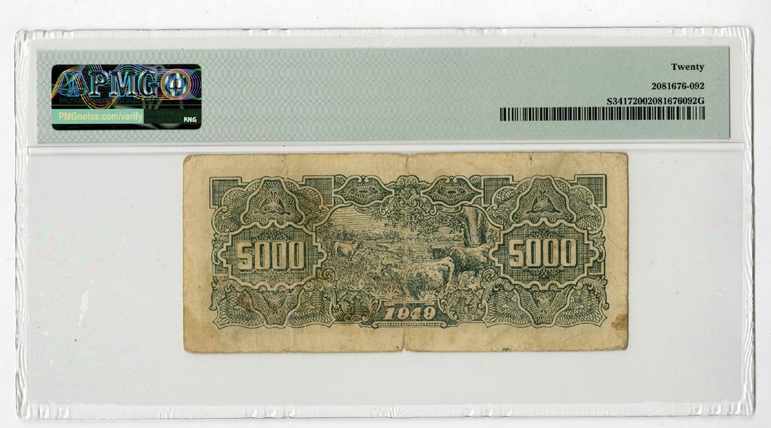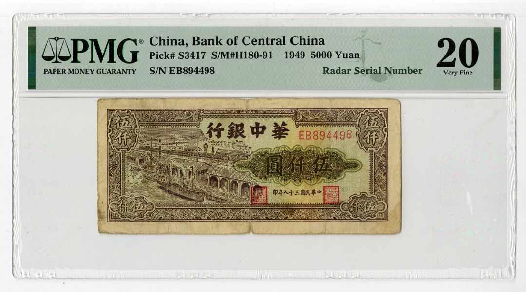 China. 1949. 5000 Yuan, P-S3417 S/M#H180-91, Radar Serial Number "EB 894498", Issued banknote, Brown on olive and yellow underprint, Ship at dock, back blue with cattle, PMG graded Very Fine 20.