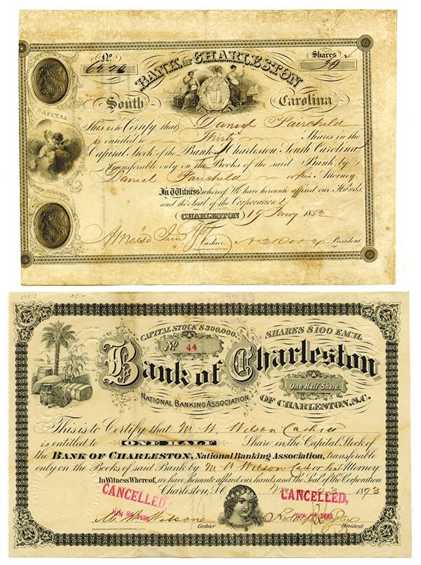 South Carolina. Pair of Stock Certificates. 1) 30 Shares Capital Stock Issued Certificate, Black print on black border, Seal of South Carolina at top with cherub at left side, Fine-VF condition with toning over certificate, Toppan, Carpenter & Co. 2) 1/2 Share Capital Stock Cancelled Certificate, Black print on black border, Ornate company title at top beside a palm tree, Low serial number 44, Cancelled stamp at bottom corners, Fine-VF condition with toning across face, Walker, Evans & Cogswell Co.