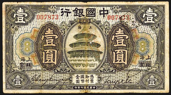 China. 1918. $1. P-51l (S/M #C294-100k). Issued banknote, Blue-black on m/c with ìTemple of Heavenî in middle, back is Blue-black. S/N 007873. Fine to Choice Fine condition with great paper quality, minimal margin issues and 2 very small pin holes in middle of note, otherwise very attractive for grade. Rare and desirable note in any condition with only one previous note having been graded in the PMG census and this is in better condition. ABNC.