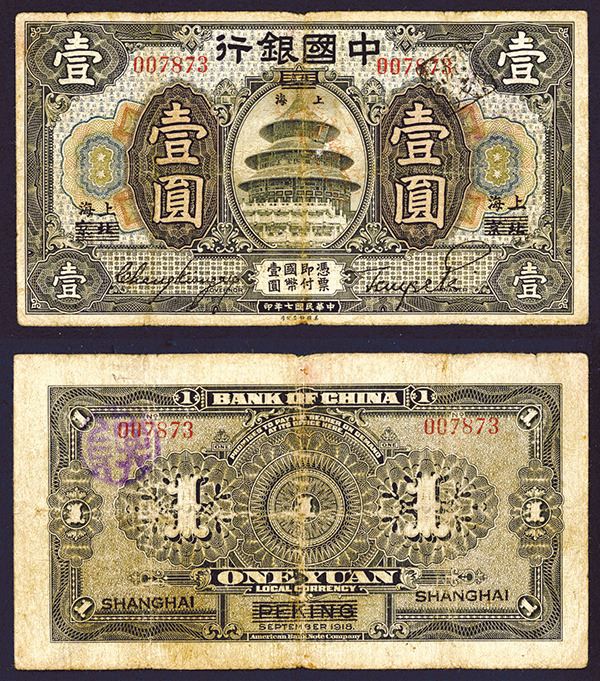 China. 1918. $1. P-51l (S/M #C294-100k). Issued banknote, Blue-black on m/c with “Temple of Heaven” in middle, back is Blue-black. S/N 007873. Fine to Choice Fine condition with great paper quality, minimal margin issues and 2 very small pin holes in middle of note, otherwise very attractive for grade. Rare and desirable note in any condition with only one previous note having been graded in the PMG census and this is in better condition. ABNC.