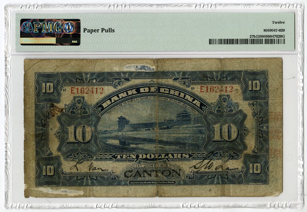 China. 1912. 10 Dollars - Canton, P-27b S/M#C294-32b, Issued banknote, Blue on multicolor underprint, S/N E162412, PMG graded Fine 12 with comment "Paper Pulls.", there are 2 small holes on top middle margin due to paper thin from the back, still as very attractive note that is rarely seen at auction. Printer: ABNC.