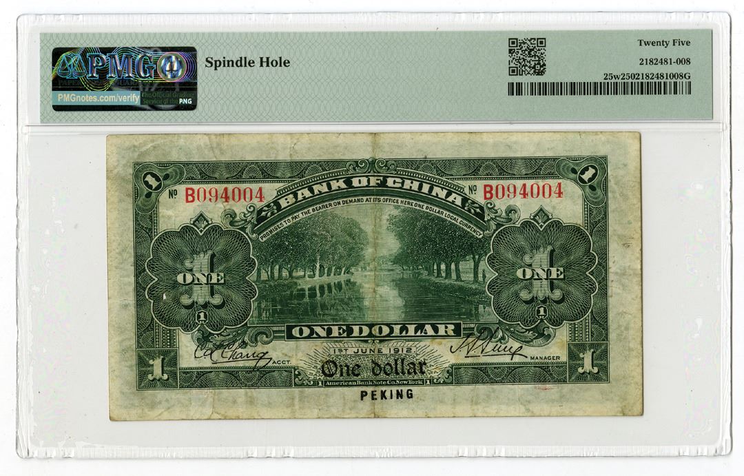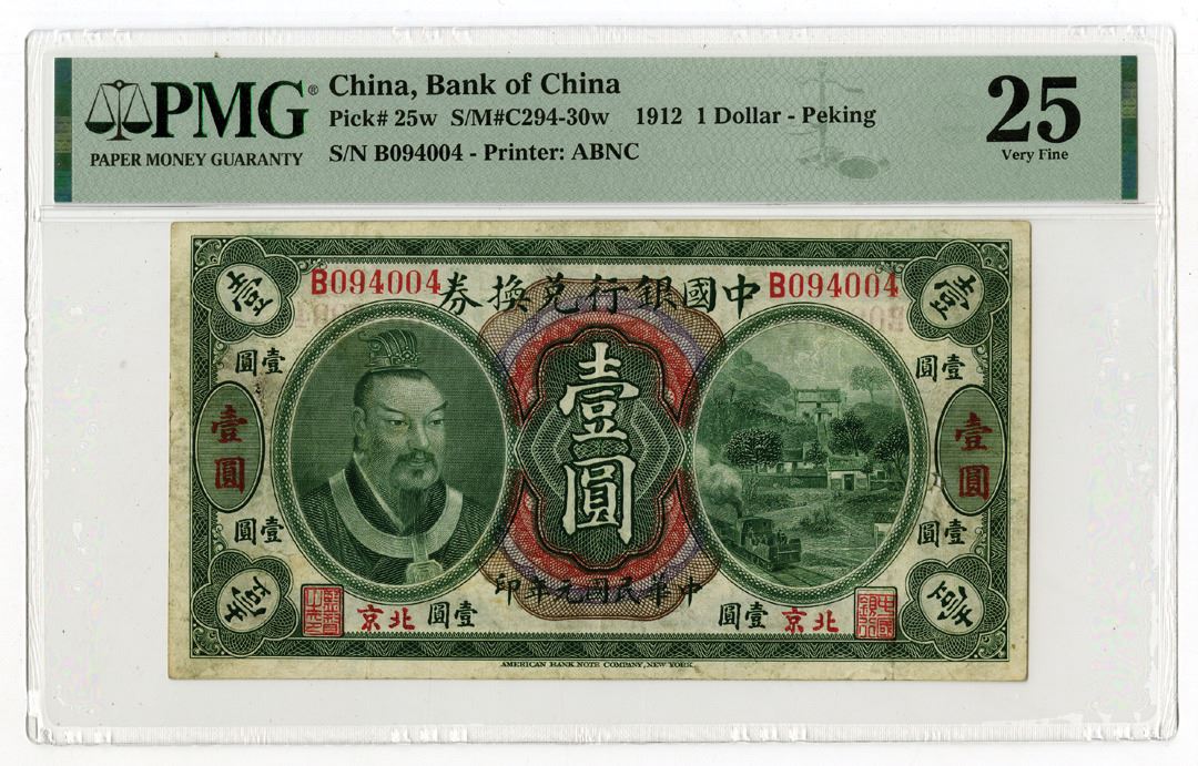 Peking, China, 1912. 1 Dollar, P-25w S/M#C294-30w, Issued banknote, Dark green on m/c underprint, Train with hillside village and right and Emperor Huang-ti at left, Back is green with overprint at bottom "One Dollar - Peking", S/N B094004, PMG graded Very Fine 25 with comment "Spindle Hole," ABNC.