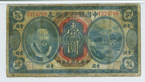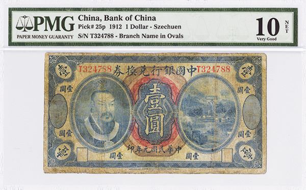Szechuen, China. $1, P-25p, S/M#C294-30p, Issued, Green on m/c, Emperor Huang-ti at left, back green, PMG graded Very Good 10 NET with note of Repaired and faded overprints and discoloration. Rare note in any condition. ABNC.