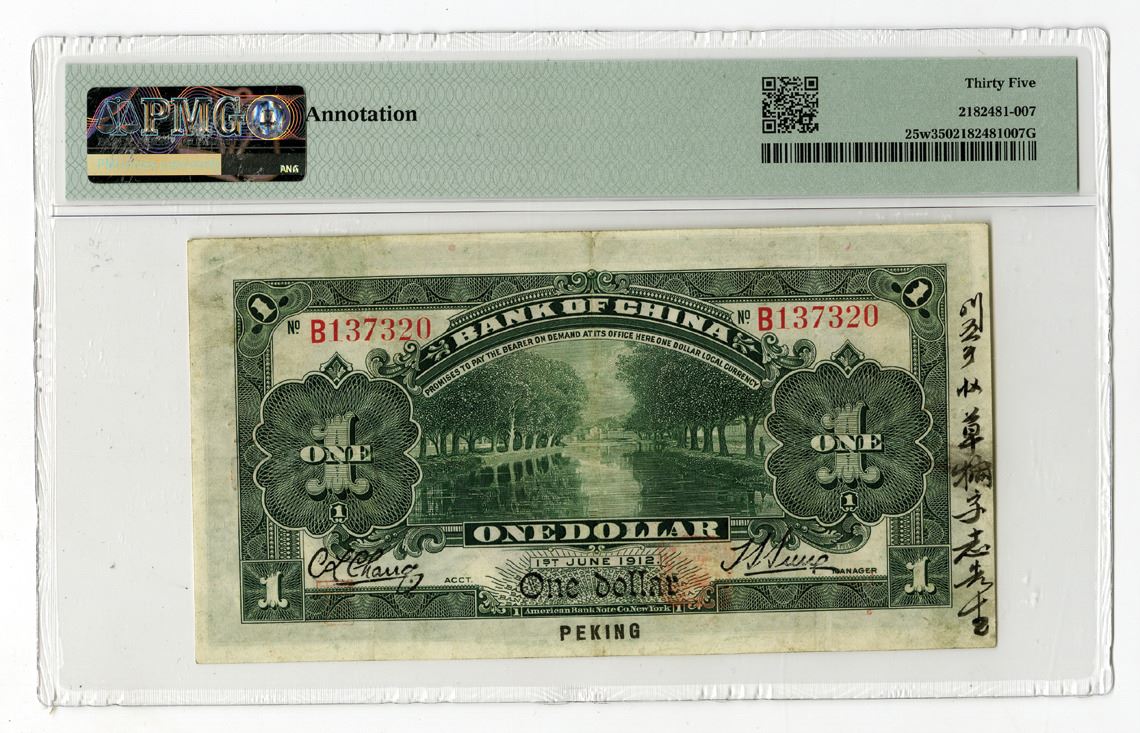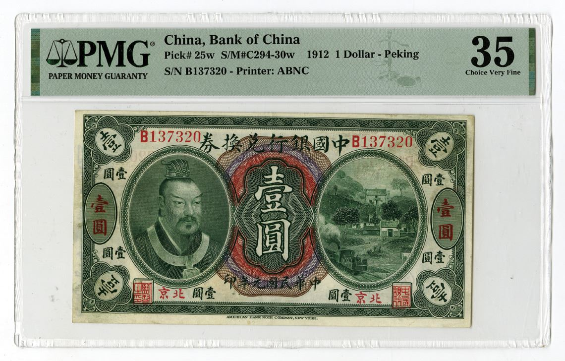 Peking, China, 1912, 1 Dollar, P-25w, S/M#C294-30w, Issued Banknote, Dark green on m/c underprint, Train with hillside village at right and Emperor Huang-ti on left, Back is green with overprint on bottom, "One Dollar - Peking", S/N B137320, PMG graded Choice Very Fine 35 with comment "Annotation," ABNC. Tied as highest graded out of 28 graded in the PMG census.