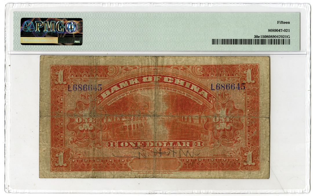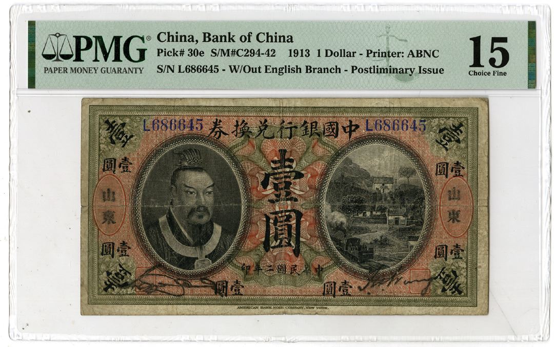 China. 1913. 1 Dollar, P-30e S/M#C294-42, Issued banknote, Olive and red, S/N L686645, W/Out English Branch, Postliminary Issue, PMG graded Choice Fine 15. Printer: ABNC.