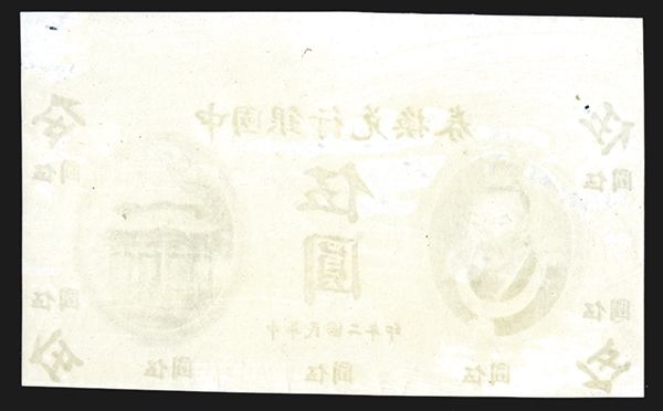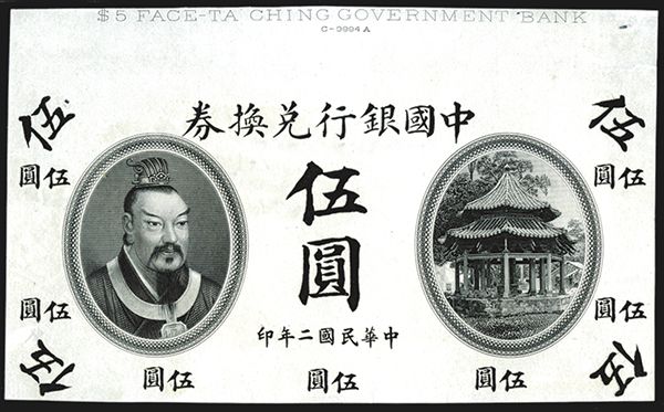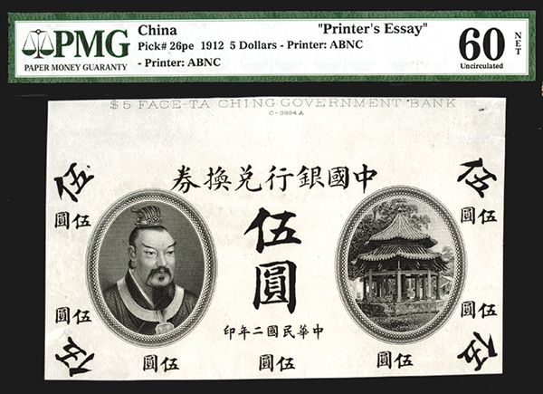 1913. $5, P-31 Unlisted essay production proof (PMG designated this P-26 by mistake), Portrait of Emperor Huang-ti at left and Gazebo on right with no borders or under prints, back blank. Top margin has label engraved on plate ì$5 Face - Ta Chíing Government Bankî. Evidently the Ta-Chíing note was altered to the Bank of China, P-31, but the title was not changed on the plate.PMG graded Uncirculated 60 NET with note of previously mounted with light glue remnants on back. Rare if not unique archival production proof of this rare issue. The lowest catalog value on any issue from the 1913, $5 series is $900 in Fine condition. A treasure for the China specialist. ABNC.