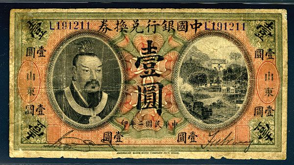 China, $1, P-30e (S/M#C294-42), Issued banknote, Portrait of Emperor Huang-ti at left and hillside village with railroad at right in black, borders are red and olive green, back orange with waterfront park at center, S/N L191211, PMG graded Choice Very Good 10 NET with note of being previously mounted. ABNC. Attractive note and rare in any condition. One of only 2 graded in the PMG census.