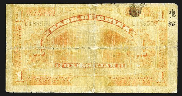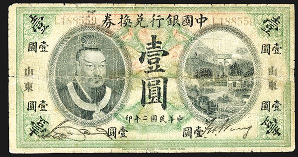 China. 1913, $1, P-30 (S/M#C294-42), Issued banknote, black on green border, red and m/c underprint with Emperor Huang-ti on left, back orange with waterfront park at center, S/N L188559, VG to Choice VG condition with fading of the red underprint and strong horizontal folds, ABNC.