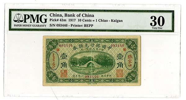 Kalgan, China, 10 Cents = 1 Chiao, P-43m S/M#C294-72a, Issued banknote, Green with red overprints, bridge in center, back purple, Russian text "Kalgan" on back, face with Manchu at left and Chinese on right, PMG graded Very Fine 30, Printer BEPP.