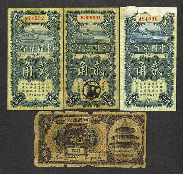 China. 10, 20 Cents. P-48b; 64a (3). S/M C294-93b; C2949-152b, d (2). Temple of Heaven on first, Monument of Bull and bridge on others. Good with rough edges on first; Others Very Fine, one with paper mounting remnants on top face. 4 pieces.