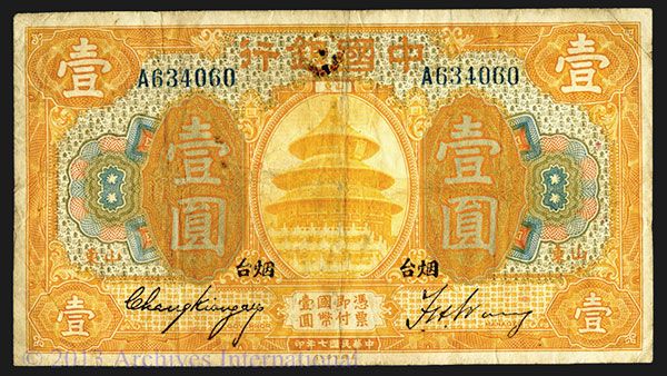 Chefoo, China (Overprinted on Shantung Issue), 1 Yuan, P-51c, S/M#C294-100, Issued banknote, Orange on m/c, VF with 4 small holes on top middle of the note, still scarce in any condition. ABNC.