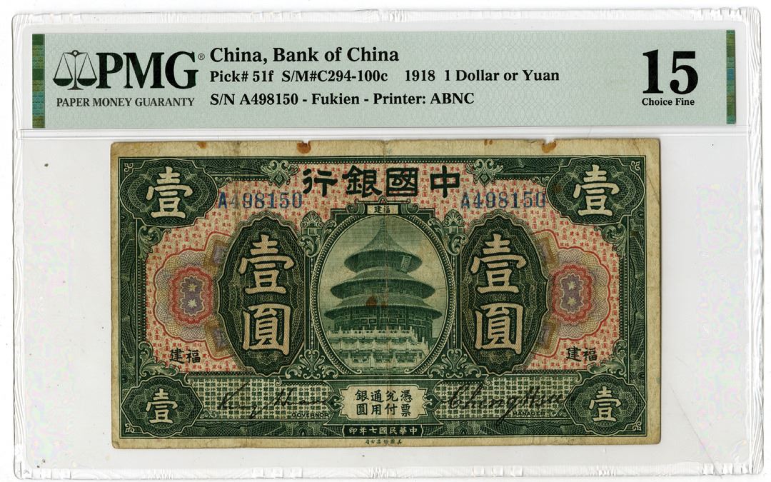 China. 1918. 1 Dollar or Yuan, P-51f S/M#C294-100c, Issued banknote, Green on multicolor underprint, S/N A498150 - Fukien, PMG graded Choice Fine 15 with comment "Rust." Printer: ABNC. A scarcer variety with only 5 appearances at auction since 2013 with this being the second highest graded example offered.