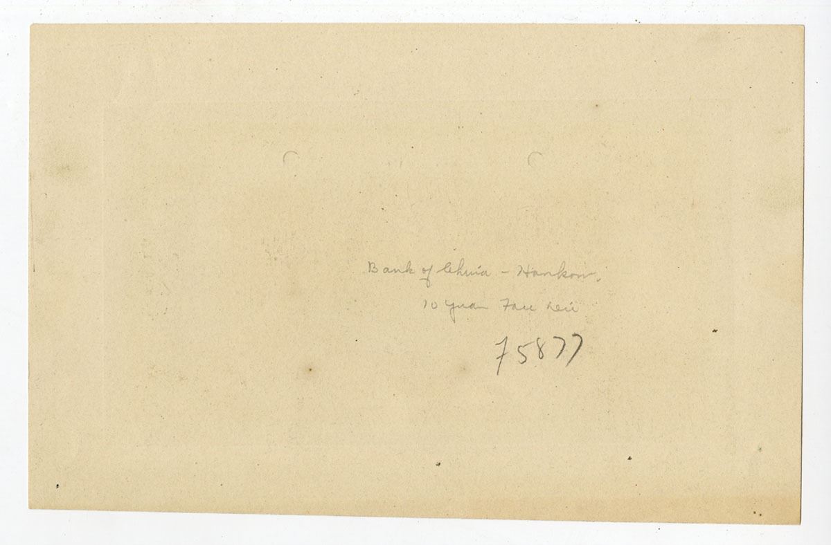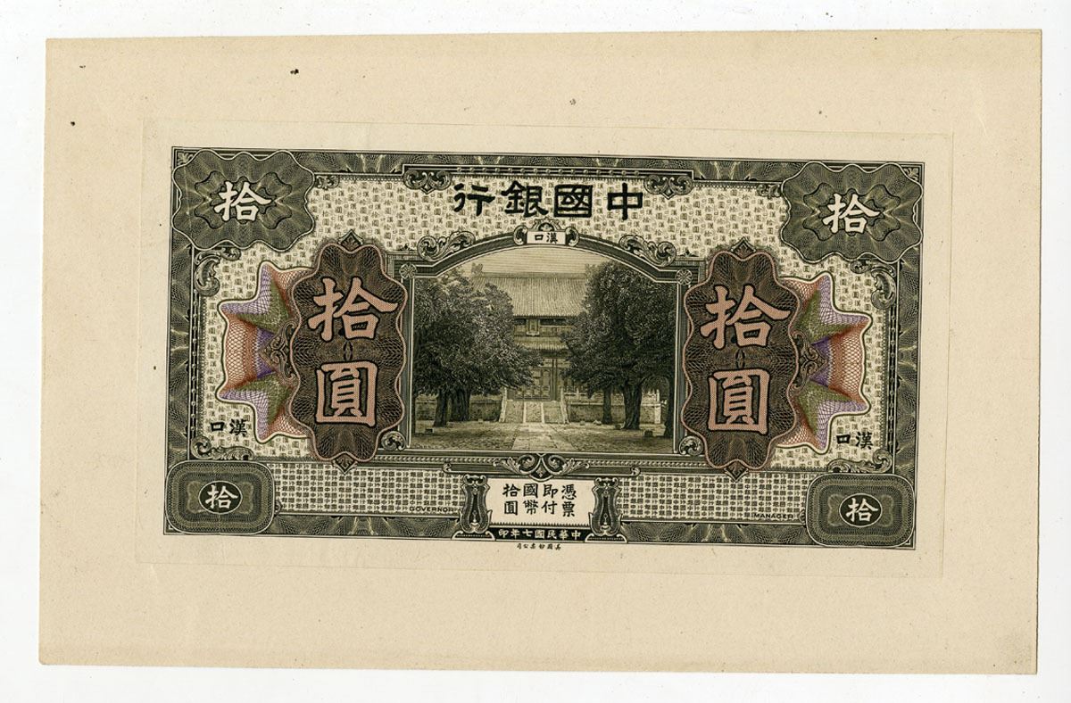 Hankow, China, 1918. 10 Yuan, P-53g S/M#C294-102, Front Proof Banknote, Olive green and dark colors on m/c underprint printed on india paper and mounted on large card, Appears in CU condition but the note has a tear on the left margin that is difficult to see. ABNC.