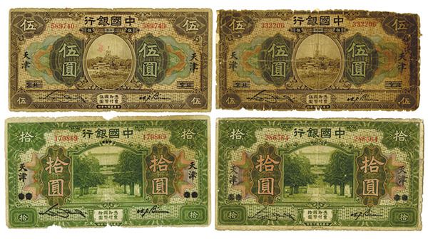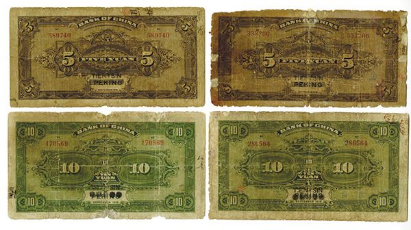 China. 5, 10 Yuan. P-52r (2); 53r (2). Tientsin over Peking. Extra hand stamps on each. Rough edges. Good or so. 4 pieces.