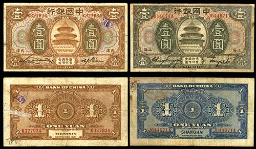 Lot of 2 notes, both $1, 1918 Issues, Includes Shanghai, P-51m, Fine; and , Tientsin, P-51q, Fine with 1.5 inch tear that is taped repaired. ABNC. From The Allen Berk Collection.