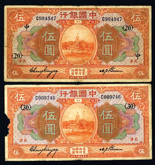 Lot of 2 notes, Both 1918, $5,Tientsin Branch Issues, P-52p, (S/M#294-101r )One is Fine+ to VF and the second would have been VF but there is a small piece missing on the left border 1 x .25 inches. ABNC.