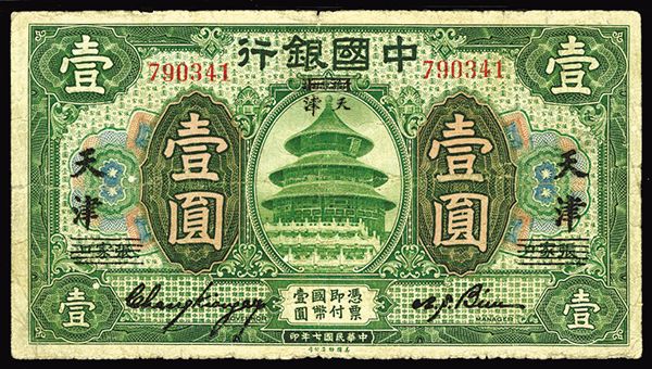Tientsin/Kalgan, China, 1 Yuan, P-51r (S/M#C294-100s), Issued banknote, green on m/c, pagoda in middle, back green, S/N 790341, PMG graded Fine 12, rare note, with this being one of 3 graded by PMG and tied for finest condition. ABNC.