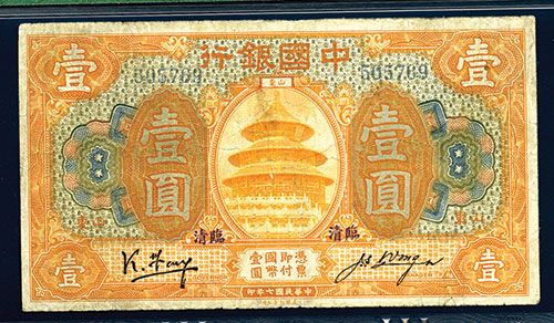 1 Yuan, P-51 Unlisted (PMG listed as P-51x) (S/M#C294-), Issued banknote, Orange-yellow on m/c, Temple of Heaven in middle, back orange-yellow, S/N #505769, PMG graded Choice Fine 15 Net with note of foreign, possibly glue remnants, on note. This is the only note of this variety in the PMG census and very possibly unique. ABNC.