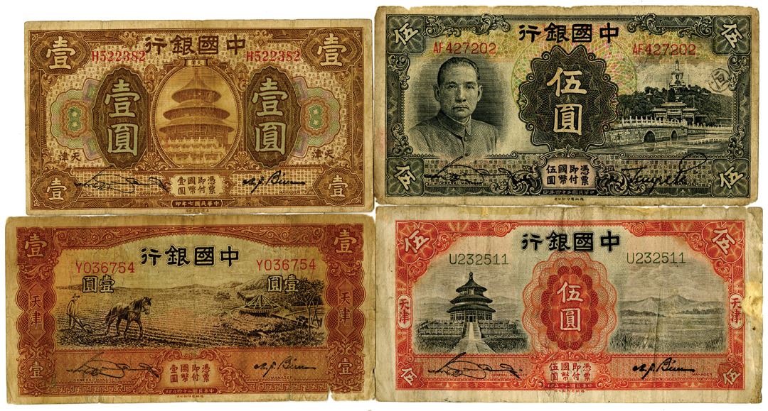 China, Lot of 4 notes, Includes 1918, Tientsin, 1 Yuan, P-51q, ABNC; 1931, 5 Yuan, P-70, TDLR; 1935, 1 and 5 Yuan, P-76 and P-77, TDLR issues, VG to VF. (4)