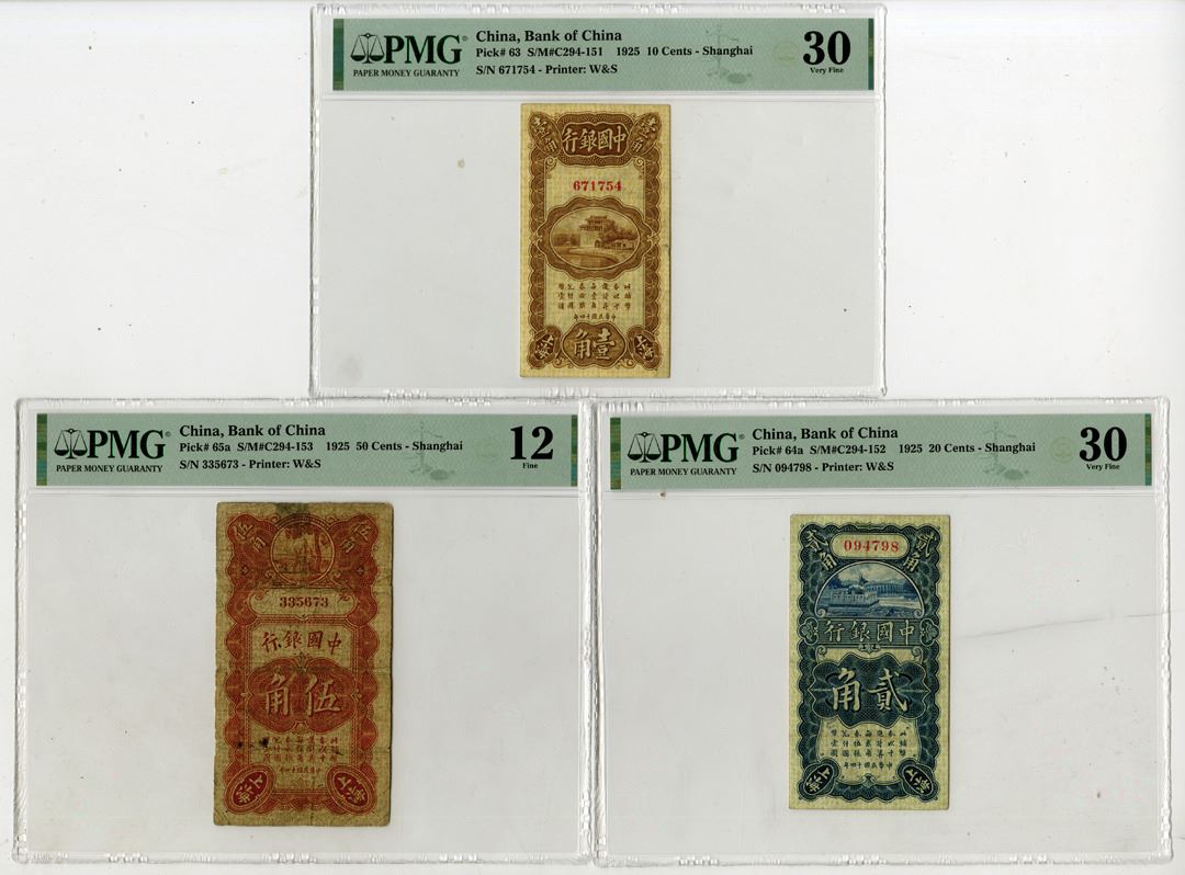 China, 1925. Lot of 3 Issued "Shanghai" Branch Banknotes, Includes: 10 Cents, P-63 S/M#C294-151, S/N 671754, PMG graded Very Fine 30; 20 Cents, P-64a S/M#C294-152, S/N 094798, PMG graded Very Fine 30; 50 Cents, P-65a S/m#C294-153, S/N 335673, PMG graded Fine 12. All printed by W&S. (3). Sold "AS IS" no returns accepted.
