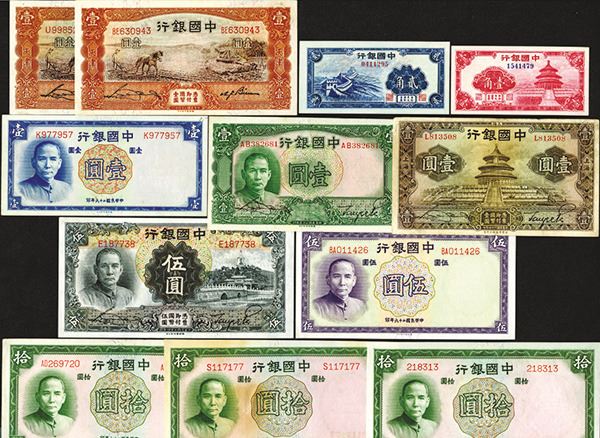 China. 10, 20 Cents; 1, 5, 10 Yuan. Shanghai, Tientsin. P-74a Very Fine+; 76 (2); 77a; 78; 79; 80; 81 (3); 82, 83. Generally About Uncirculated with a few spots to Uncirculated, except where noted. 12 pieces.