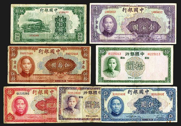 China. Lot of 7 notes, all Bank of China issues. Includes 1942 issue, 50 Yuan, P-98 S/M#C294-270, VF with small stain on back; also includes are various 1937 and 1940 issues in VG to VF. Nice assortment.