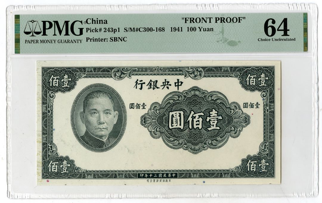 China, 1941. 100 Yuan, P-243p1, S/M#C300-168, Front Proof, Gray printing with portrait of SYS at left, PMG graded Choice Uncirculated 64 with comment "previously mounted," Printer: SBNC.