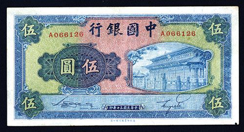 5 Yuan, P-93 (S/M#C294-262), Issued banknote, blue on m/c, back blue, S/N A066126, Crisp Choice XF with one light vertical fold keeping this note fro Choice AU. Attractive with large even margins, bright colors and only a small ink spot on the lower right corner tip. CMPA, printer.