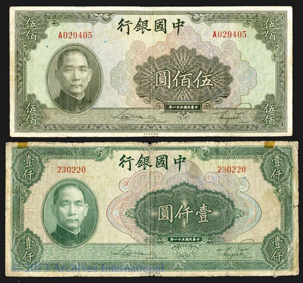 China, Lot of 2 notes, Both 1942 "ABN" Issues, Includes 500 Yuan, P-100a, S/M#C294-272, Issued banknote, Green on m/c with SYS on left, back olive green, Choice VF to XF; 1000 Yuan, P-99, S/M#C294-271, Issued banknote, Olive green on m/c with SYS on left, back green, Choice Fine to VF with a stamp hinge reinforcement of the top back middle vertical fold where there is a small split. Scarce note in any condition. ABNC