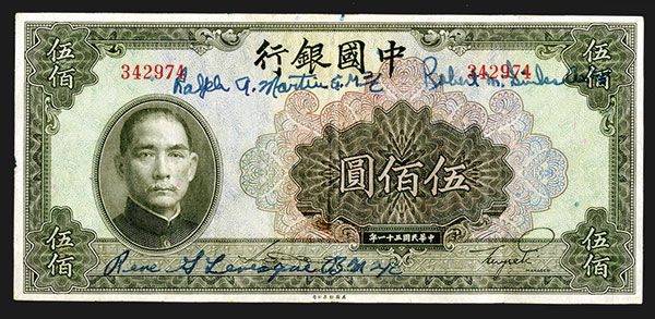 China, 500 Yuan, P-99, S/M#C294-271, Issued banknote, Olive green on m/c with SYS on left, back olive green, This note was signed by a U.S. serviceman sometime in the past as a souvenir during WW II, otherwise, the note would grade Choice VF to XF, Bright colors, large margins and sharp corners enhance this attractive and scarce note. ABNC