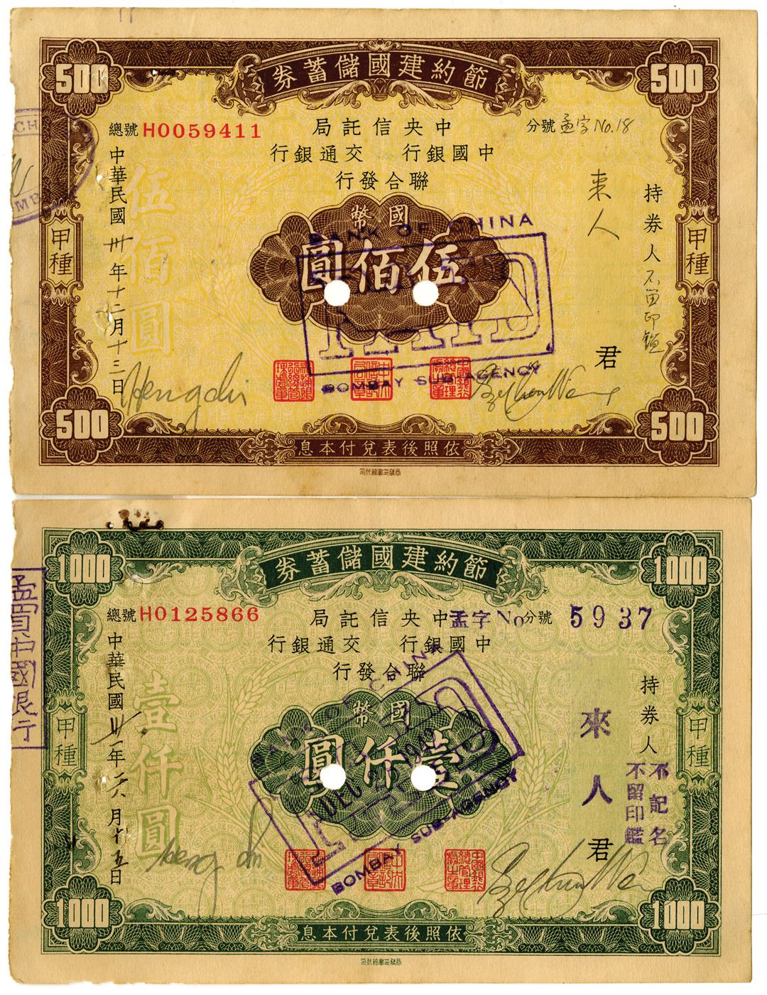 China (Bombay Agency in India), Lot of 2 certificates, 500 and 1000 Yuan notes, Both cancelled with hand stamps and POC's, XF to AU condition. (2)