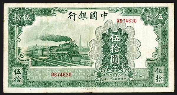 China. 50 Yuan, P-98, S/M#C294-270, Steam train at left. Fine to VF.