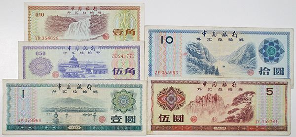 China. Lot includes a set of foreign exchange certificates in denominations of 0.10, 0.50, 1, 5, and 10 Yuan, colorful scenic views at front, English and Chinese text at back. P-FX1; FX2; FX3; FX4; FX5. Fine to VF. (5)
