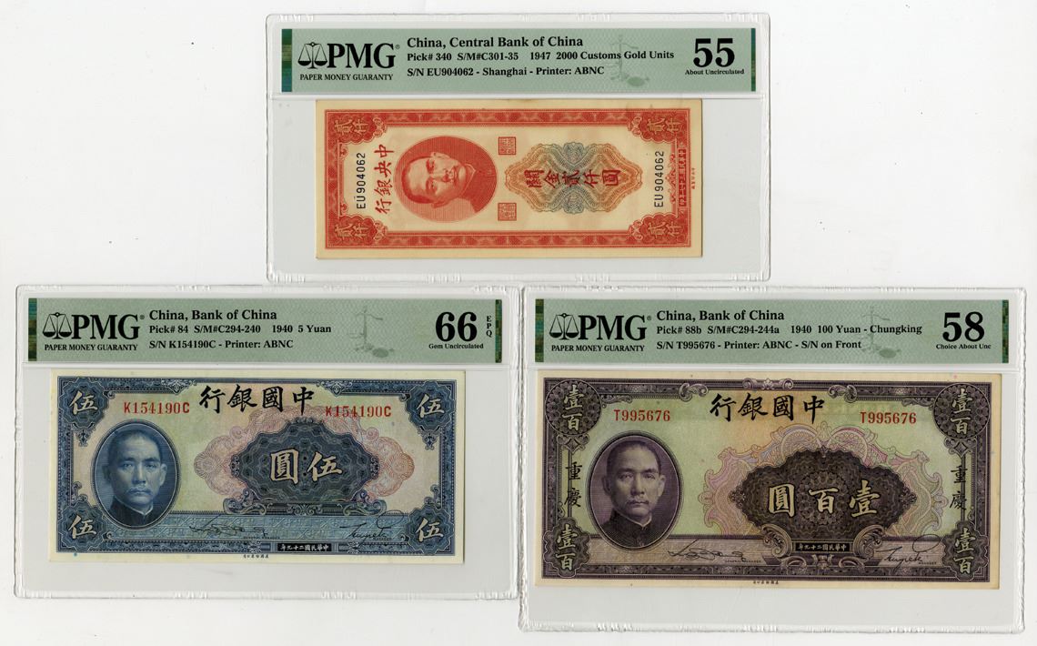 China, 1940-47. Lot of 3 Issued Banknotes, Includes: Bank of China 5 Yuan, P-84 S/M#C294-240, S/N K154190C, PMG Gem Unc 66 EPQ; 100 Yuan, P-88b S/M#C294-244a, S/N T995676, PMG Choice About Unc 58; and, Central Bank of China 2000 CGUs, P-340 S/M#C301-65, S/N EU904062, PMG graded About Uncirculated 55. All notes printed by ABNC. (3). Sold "AS IS" no returns accepted.