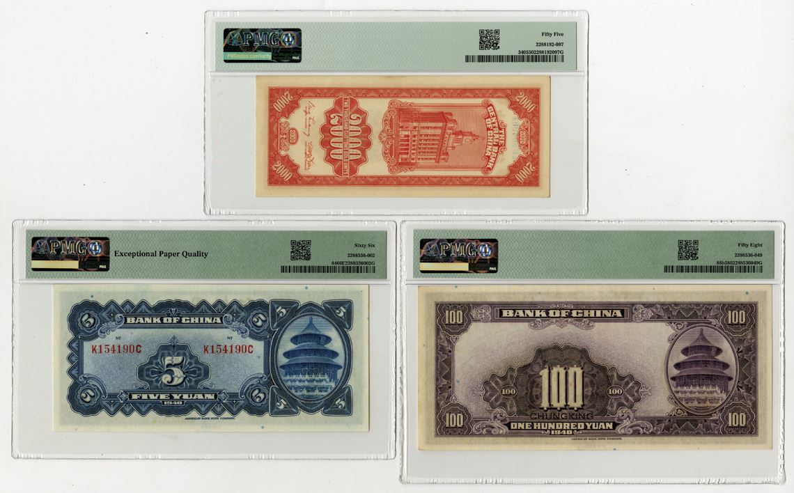 China, 1940-47. Lot of 3 Issued Banknotes, Includes: Bank of China 5 Yuan, P-84 S/M#C294-240, S/N K154190C, PMG Gem Unc 66 EPQ; 100 Yuan, P-88b S/M#C294-244a, S/N T995676, PMG Choice About Unc 58; and, Central Bank of China 2000 CGUs, P-340 S/M#C301-65, S/N EU904062, PMG graded About Uncirculated 55. All notes printed by ABNC. (3). Sold "AS IS" no returns accepted.