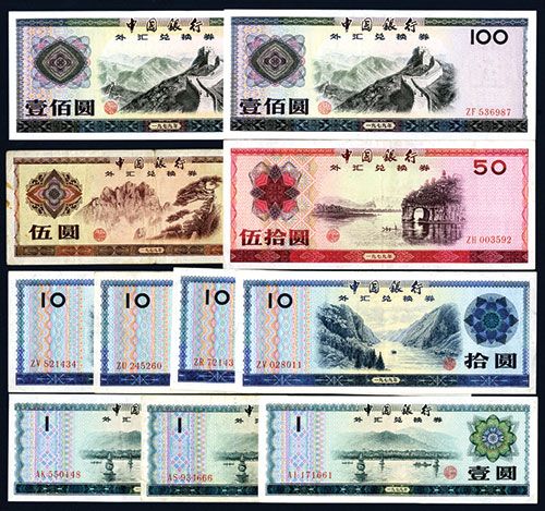Lot of 11 notes, All Foreign Exchange Certificates, 1 Yuan to 100 Yuan, Includes 50 Yuan, FX6 in Choice XF to AU and 2 examples of 1000 Yuan, FX7 or FX9, both CU. From The Allen Berk Collection.