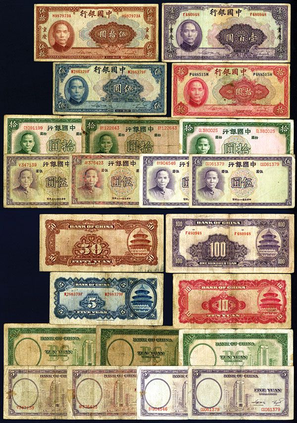 China. Sun Yat Sen portrait on all, Temple of Heaven on back of four, others with Bank building. Issues of 1937 and 1940. Pick #80, 81, 83, 84, 87, 88 represented. Group of 11 pcs.