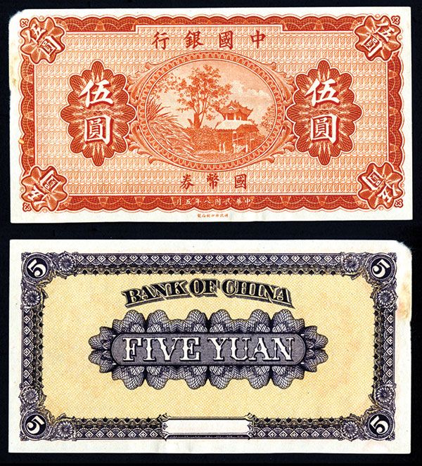 China, 5 Yuan, P-59r (S/M#C294-12), Remainder banknote, Orange, No Serial Numbers or place name, appears uncirculated but the top left corner tip is rounded and there are light stains on the left top margin. BEPP.
