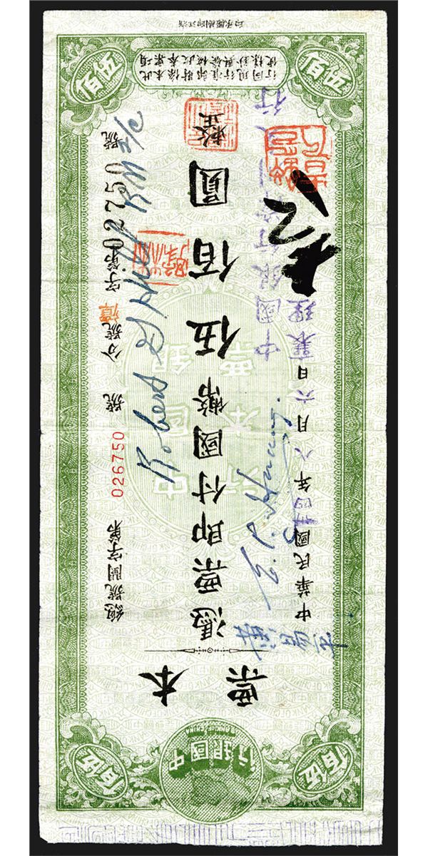 China, 500 Yuan, P-Unlisted, S/M# Unlisted, Lime green on light green, back green with building in middle, the note grades VF to choice VF NET with graffiti on the face when it was part of a "Short Snorter", This note was signed by a U.S. serviceman sometime in the past as a souvenir. First time seen by cataloger and extremely rare in any form.