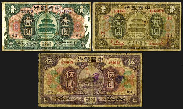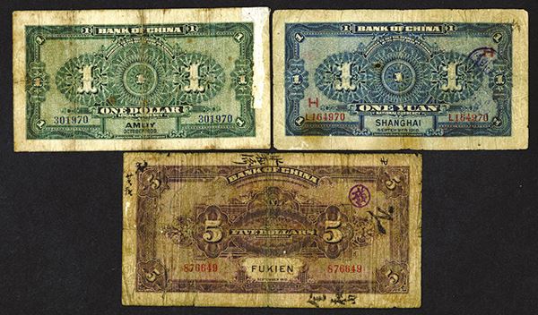 China. 1918 Fukien 5 Yuan; Shanghai Yuan; 1930 Amoy Yuan. Fair to Good, paper loss, paper attached, graffiti.