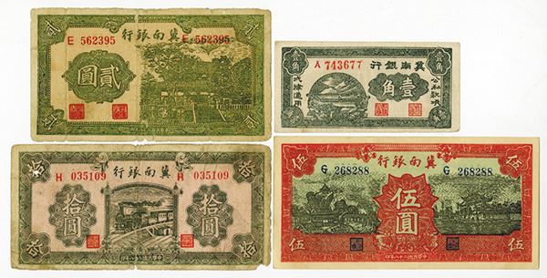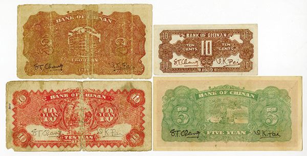 China, Lot of 4 notes, Includes 10 cents = 1 Chiao, P-S3064a, Issued, AU; 2 Yuan, P-S3068, VF; 5 Yuan, P-S3069Ca, Uncirculated to CU; and $10, P-S3070a, Issued, VG to Fine with missing lower right corner tip, small holes and wear. Attractive group.